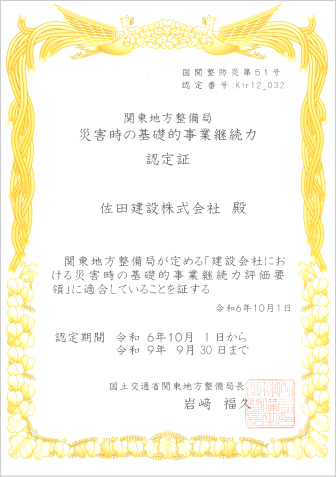 国土交通省が推進する災害時事業継続計画(BCP)の認定を取得しています。