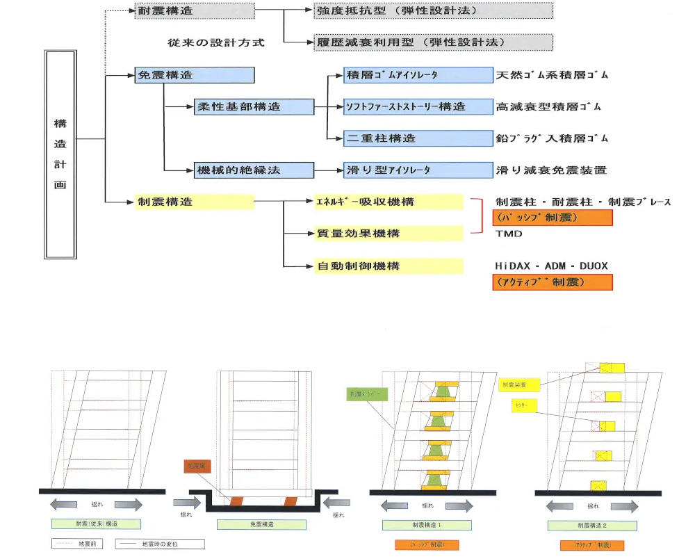 | 制震構造 | 極軟鋼、粘性ダンパー、 ハイブリッド型ダンパー等 | 軽く柔軟性のある建物 塔状の建物等 | 地震力に対し50~70% | やや激しく揺れる |